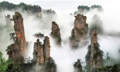 张家界国家森林公园是中国第一个国家级森林公园,集神奇、钟秀、雄浑、原始、清新于一体,以岩称奇。园内连绵重叠着数以千计的石峰,奇峰陡峭嵯峨,千姿百态,或孤峰独秀,或群峰相依,造型完美,形神兼备。张家界国家森林公园主要景观有金鞭溪、黄石寨、腰子寨、琵琶溪、砂刀沟、后花园、朝天观等七条旅游线,它们将您带到一个个美妙的仙境佳地。公园景区森林覆盖率达98%,木本植物93科517种,比整个欧洲所有的木本植物种数多一倍以上,其中属国家一级保护的珍稀树种有珙桐、银杏、香果树、鹅掌楸等7种,珙桐、银杏就有“活化石”之称。这里鸟类有41种,兽类有28种,其中属国家保护的珍稀动物有红嘴相思鸟、长尾雉、水獭、猕猴、麝、貉等,被誉为“天然动物园”。公园四季如春,山花烂漫,境内还有罕见的“龙虾花”,高大的山荷花,名贵的兰花,稀有的紫色杜鹃和地雷花,以及漫山的百合花、樱花、株栗花、长杜鹃等,俨然一个天然的百花园。