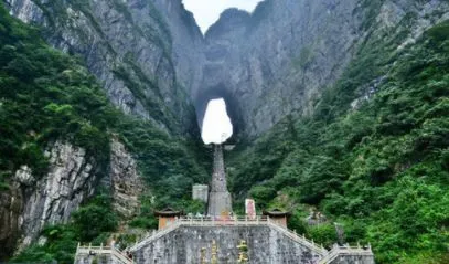 天门山位于湖南省张家界市永定区,因自然奇观天门洞而得名,也因天门洞而蜚声世界,被誉为“湘西第一神山”、“武陵之魂”和“张家界之魂”。 三国吴永安六年(公元 263 年),嵩梁山忽然峭壁洞开,玄朗如门,形成迄今罕见的世界奇观――天门洞,天门洞南北对穿,门高131.5米,宽57米,深60米,拔地依天,宛若一道通天的门户,从此而得名天门山。 山顶相对平坦,保存着完整的原始次森林,有着很多极为珍贵和独特的植物品种,森林覆盖率达90%。其间古树参天,藤蔓缠绕,青苔遍布,石笋、石芽举步皆是,处处如天成的盆景,被世人誉为世界最美的空中花园和天界仙境。