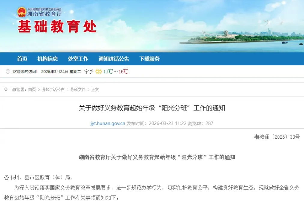 2026年秋季学期起,全省义务教育起始年级全面推行 “阳光分班”,公办民办一视同仁。
