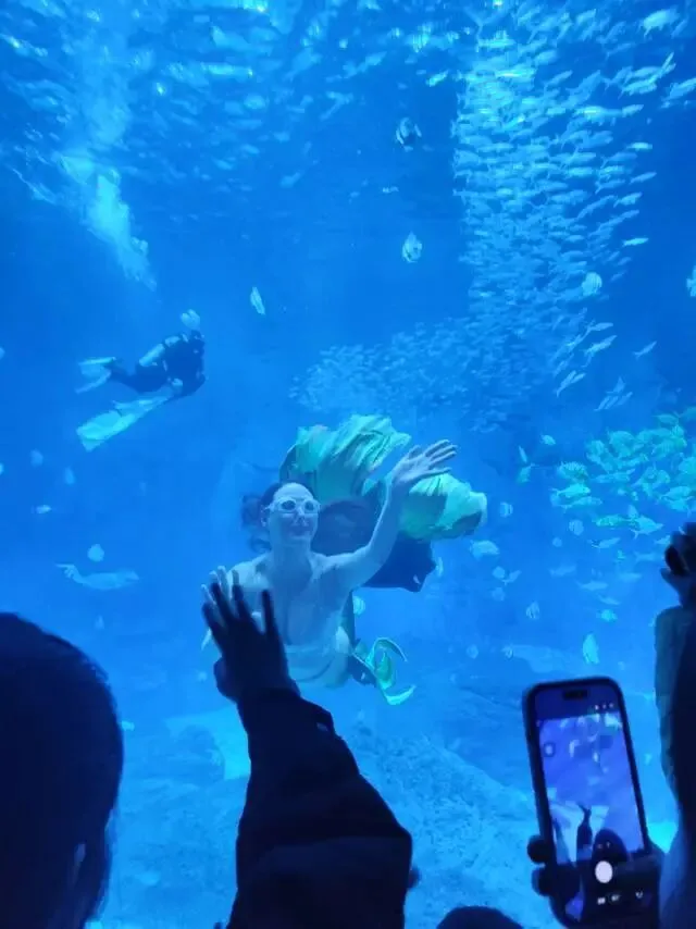 2. 美人鱼表演:小哥哥小姐姐在水下翩翩起舞,和鱼儿们共舞,在蓝色的光影里,真的像童话一样美,看得我移不开眼!