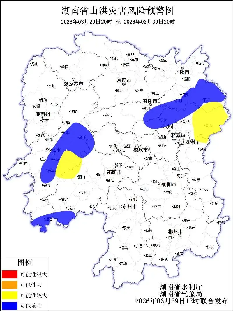 根据省气象局3月29日预报,省水利厅与省气象局联合会商得出如下结论:受降雨影响,29日20:00至30日20:00,岳阳市,怀化市,长沙市,株洲市,邵阳市,湘潭市,益阳市,娄底市等局地可能发生山洪灾害。