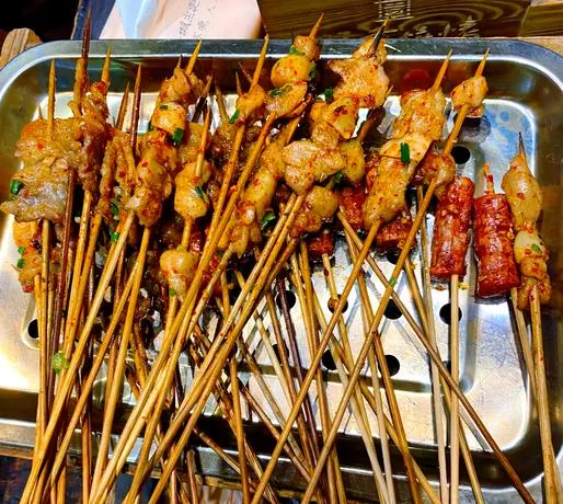 盟重烧烤这家店, 是长沙夜宵圈的老大哥之一。很多人觉得长沙烧烤就是辣, 但你真吃过盟重就会发现, 长沙烧烤的核心不是辣椒放得多, 是辣椒和肉的配合得刚好。烤肉不能太干, 也不能太油, 辣椒粉得是粗的, 不能是细的, 因为粗的辣椒粉吃起来有颗粒感, 才能挂住肉的油脂。