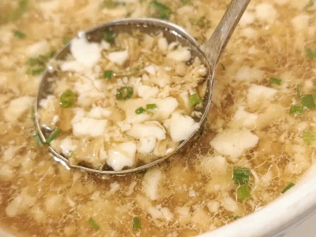 豆腐脑汤清淡解辣,跟咸蛋黄茄子绝配,一顿饭总要有不辣的菜品。