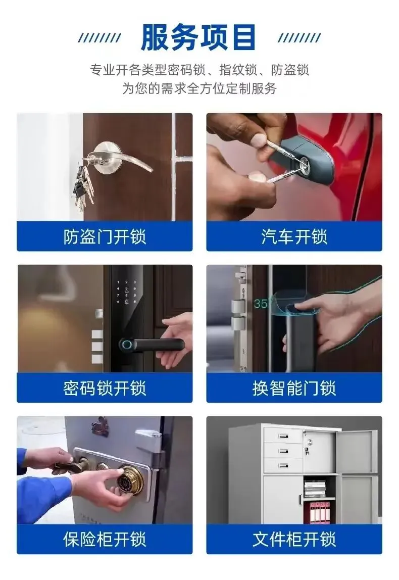 🔑 家庭开锁:防盗门开锁、卧室门开锁、换锁芯🚗 汽车开锁:车门开启、钥匙匹配、遥控修复🏢 商业开锁:办公室门禁、玻璃门锁维修🔐 换锁服务:各类锁具更换、升级智能锁🧰 锁具维修:锁芯卡顿、钥匙断裂、锁体故障处理🚪 安防升级:指纹锁安装、密码锁安装与调试