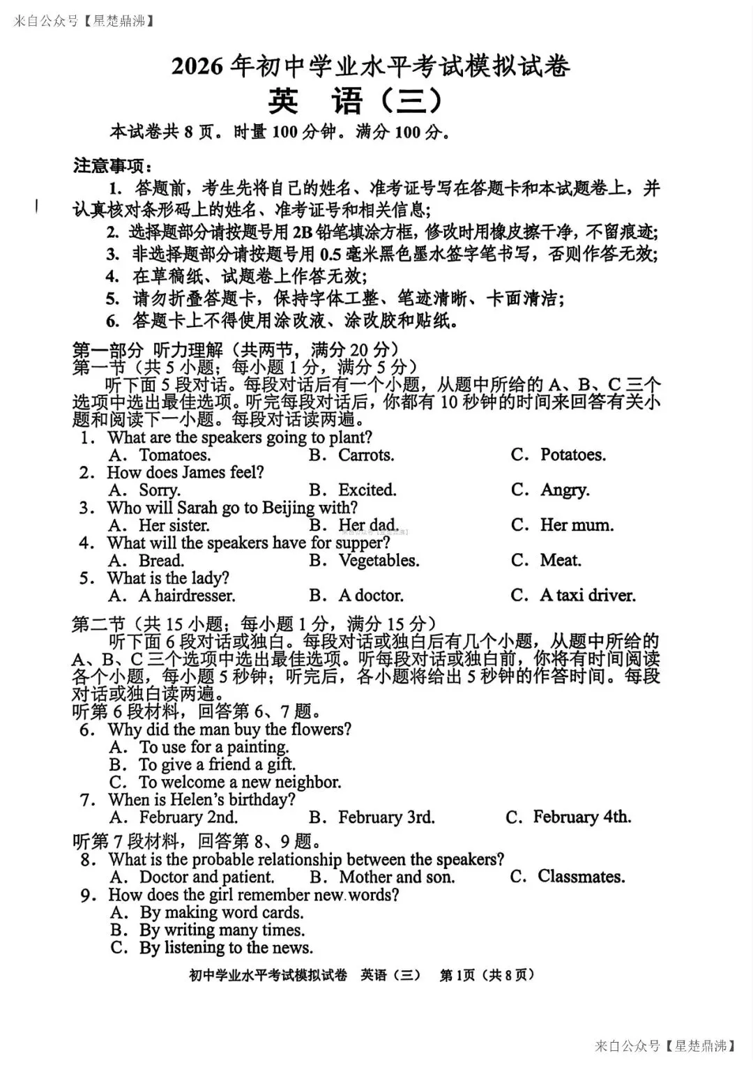 >湖南省长沙市教科院2025-2026学年九年级下册模拟考试英语试卷(含答案)PDF科下载打印