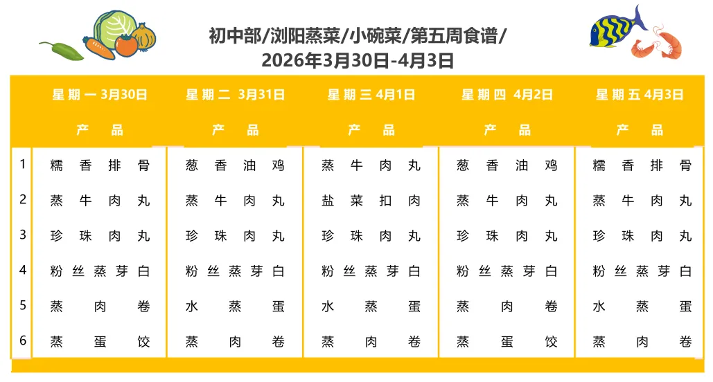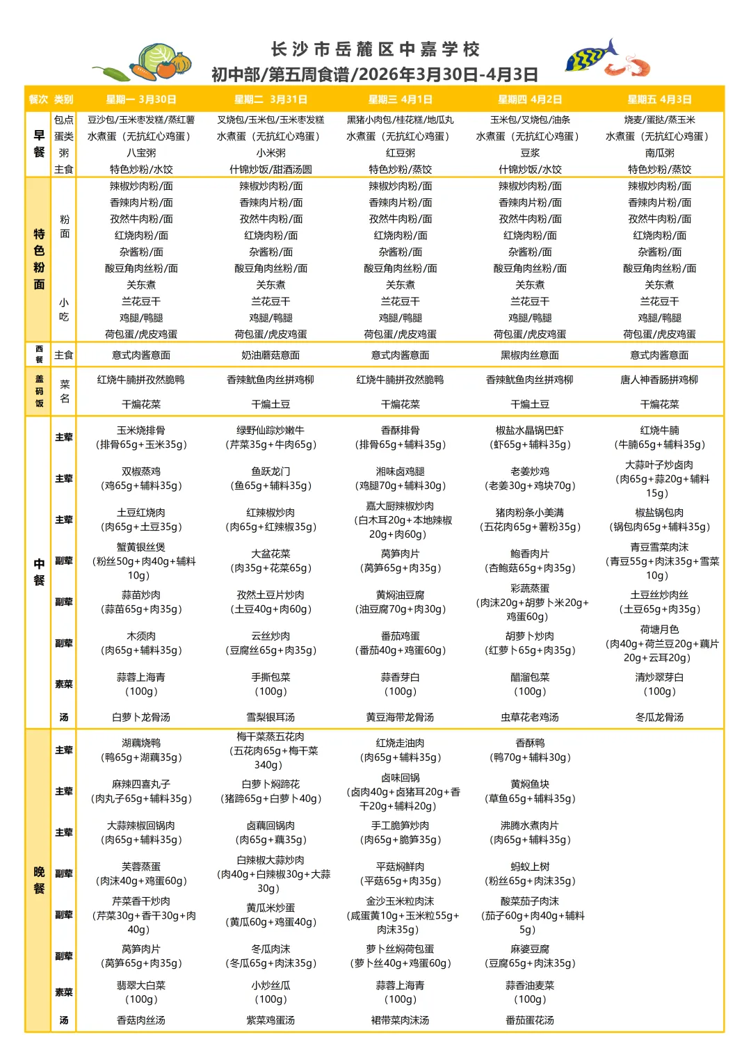 嘉美“食”光丨长沙市岳麓区中嘉学校初中部食堂第五周带量营养食谱