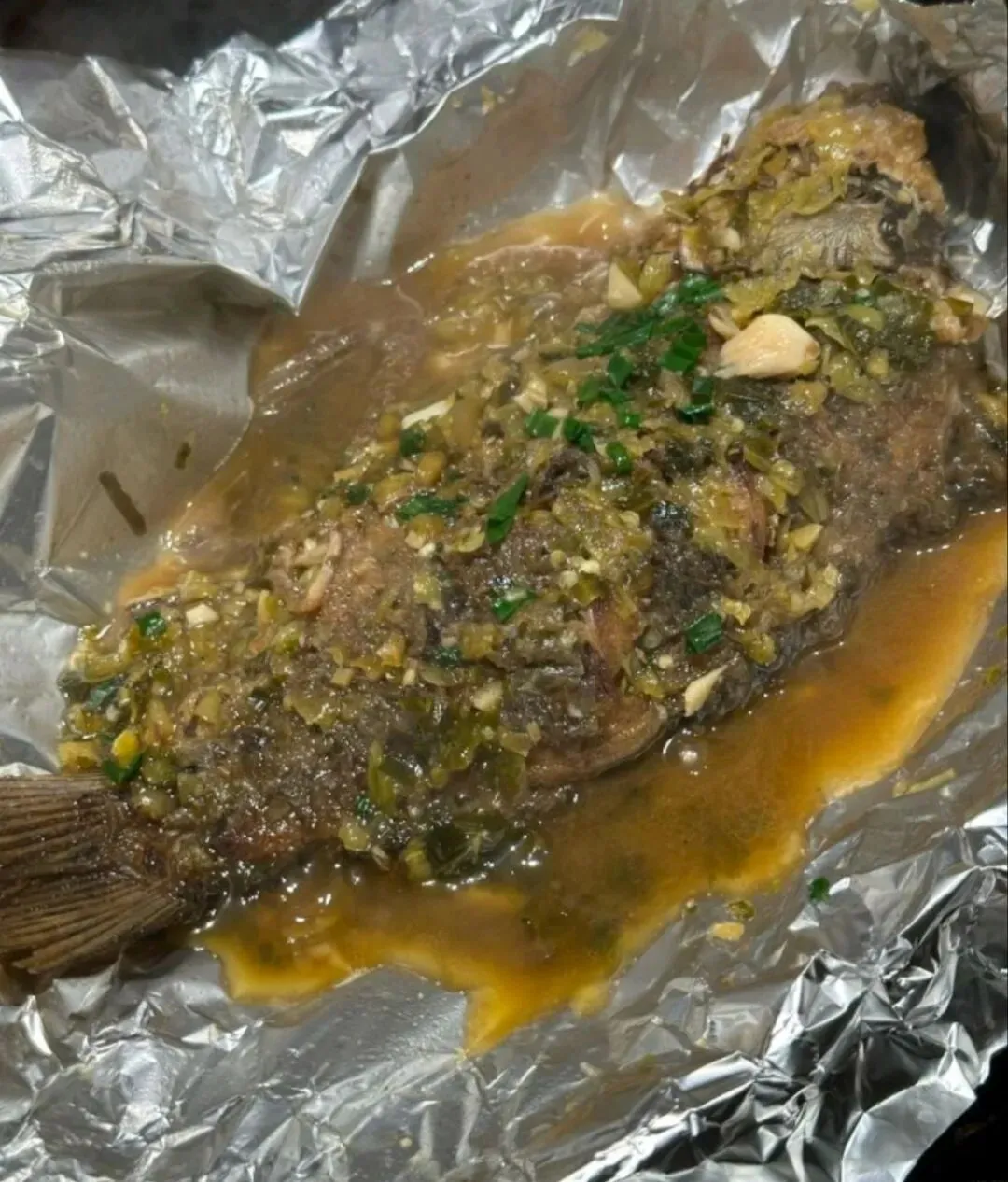 实打实的镇店之宝,几乎每桌都必点!锡纸焖煮牢牢锁住鲜味,鱼肉嫩到入口即化,茶油+黄贡椒的香辣底味绝了,鲜辣过瘾,连汤汁都想拌米饭。