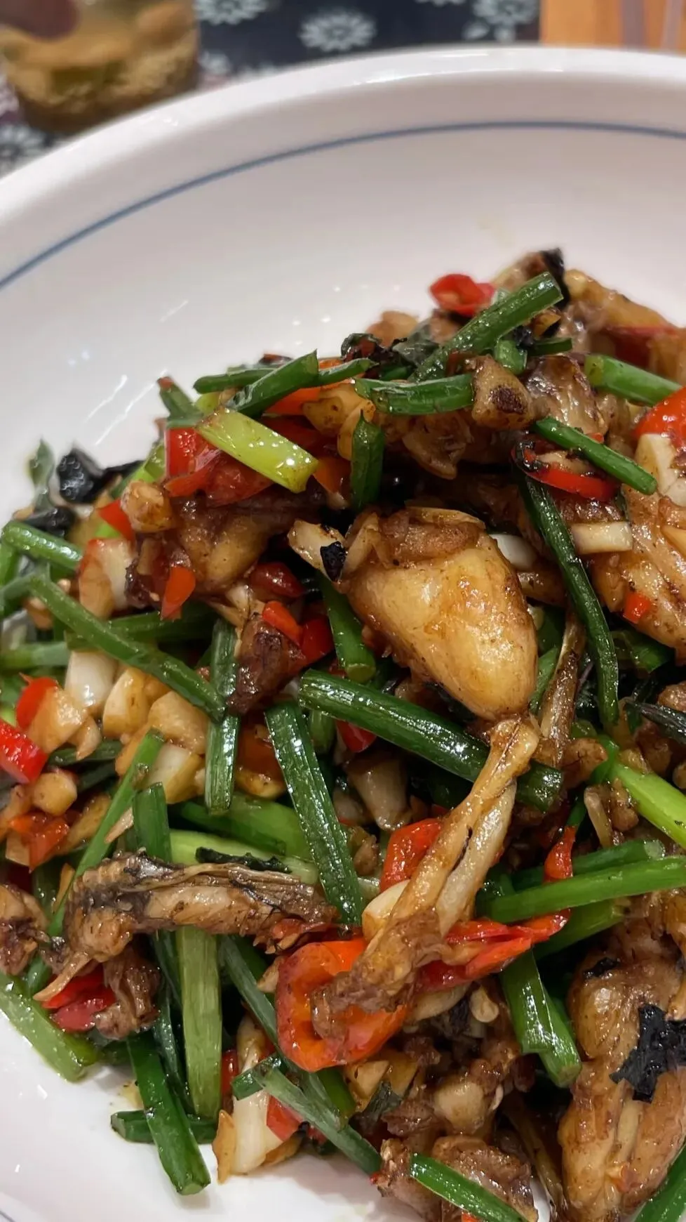 现点现杀,全程可视,新鲜看得见。大火猛炒,锅气直冲脑门,田鸡肉Q弹紧实,一抿脱骨。韭菜花+小米辣+紫苏神仙组合,干香入味,下酒下饭双绝,一口就上头,根本停不下来。