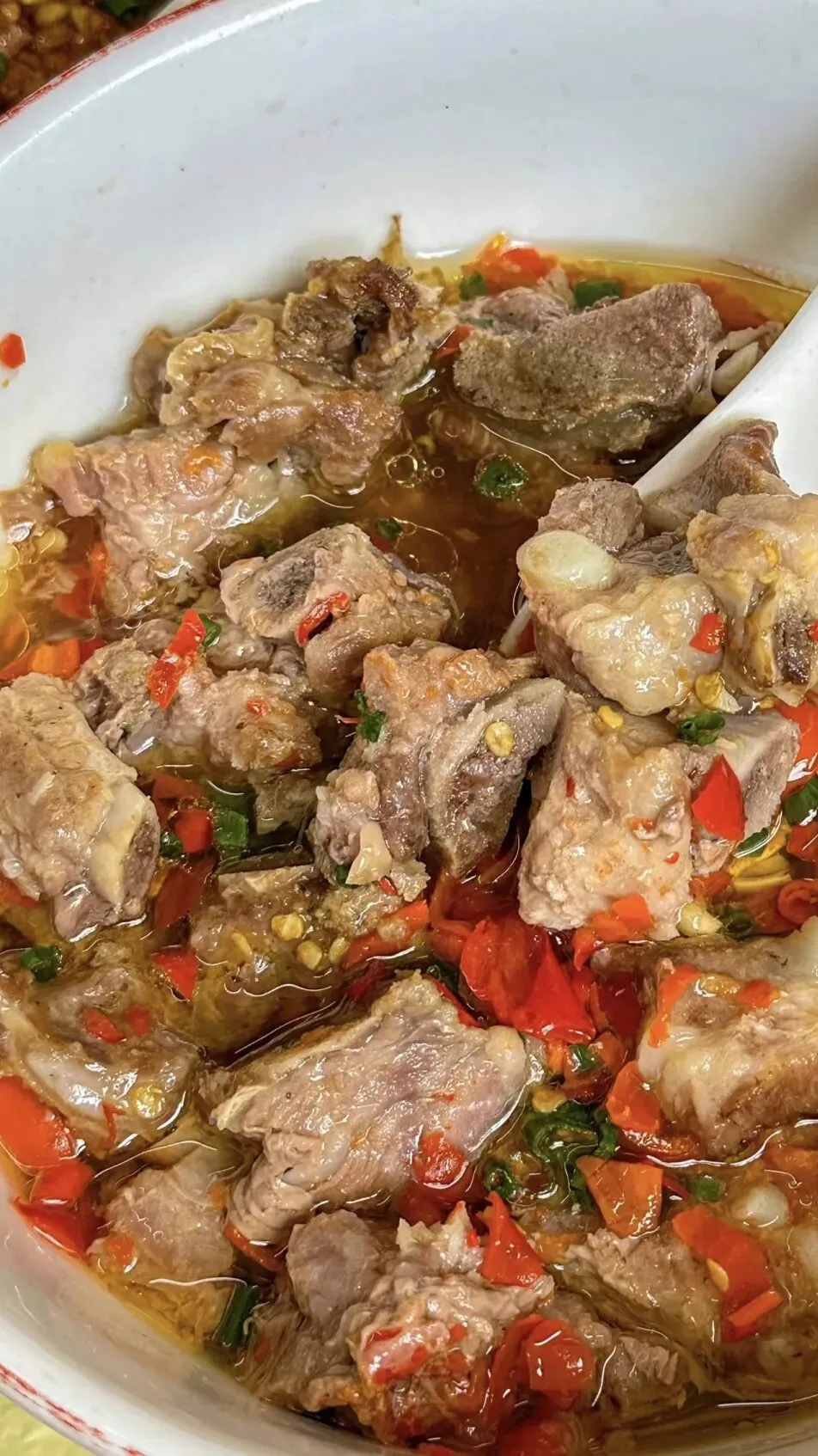 新鲜肋排提前腌制,蒸得软烂脱骨。自家坛子剁椒,酸辣鲜香,渗透到每一丝肉里,骨头缝都有味。汤汁拌米饭,香到舔盘,下饭神器实锤。