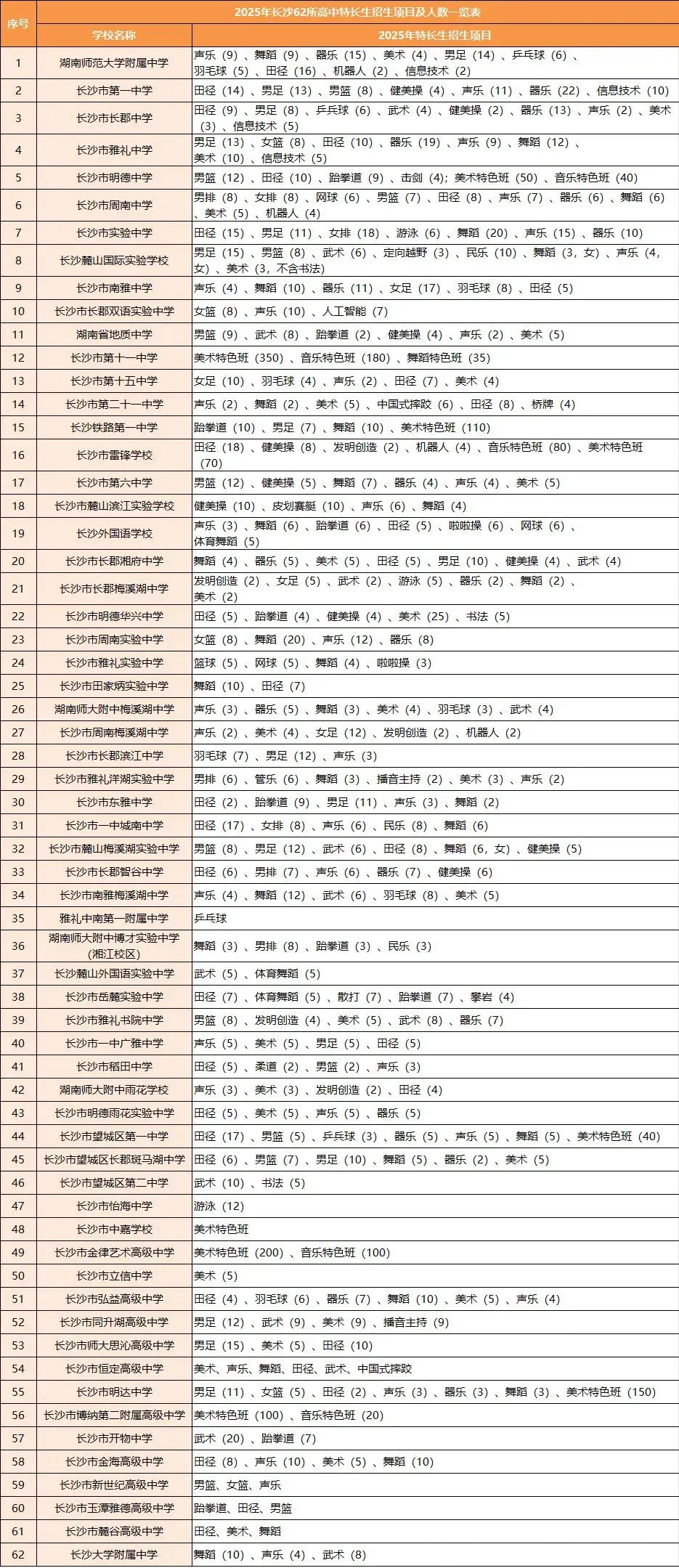适用学校/专业:附中雨花;周梅的声乐、美术、发明创造、机器人项目;六中(除篮球外其他项目);长郡梅溪湖的美术专业;长沙县所有特长生(2026年长沙县特长生计划275人,涵盖音乐、体育、美术、科技四类)。