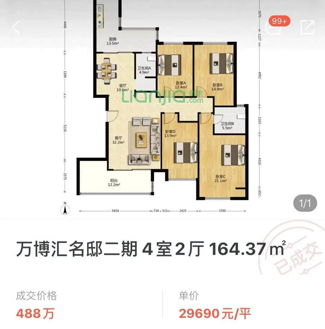 砂子塘小学学区房万博汇成交了一套164.37平的4室2厅,成交价格为488万元,单价高达29690元/平。