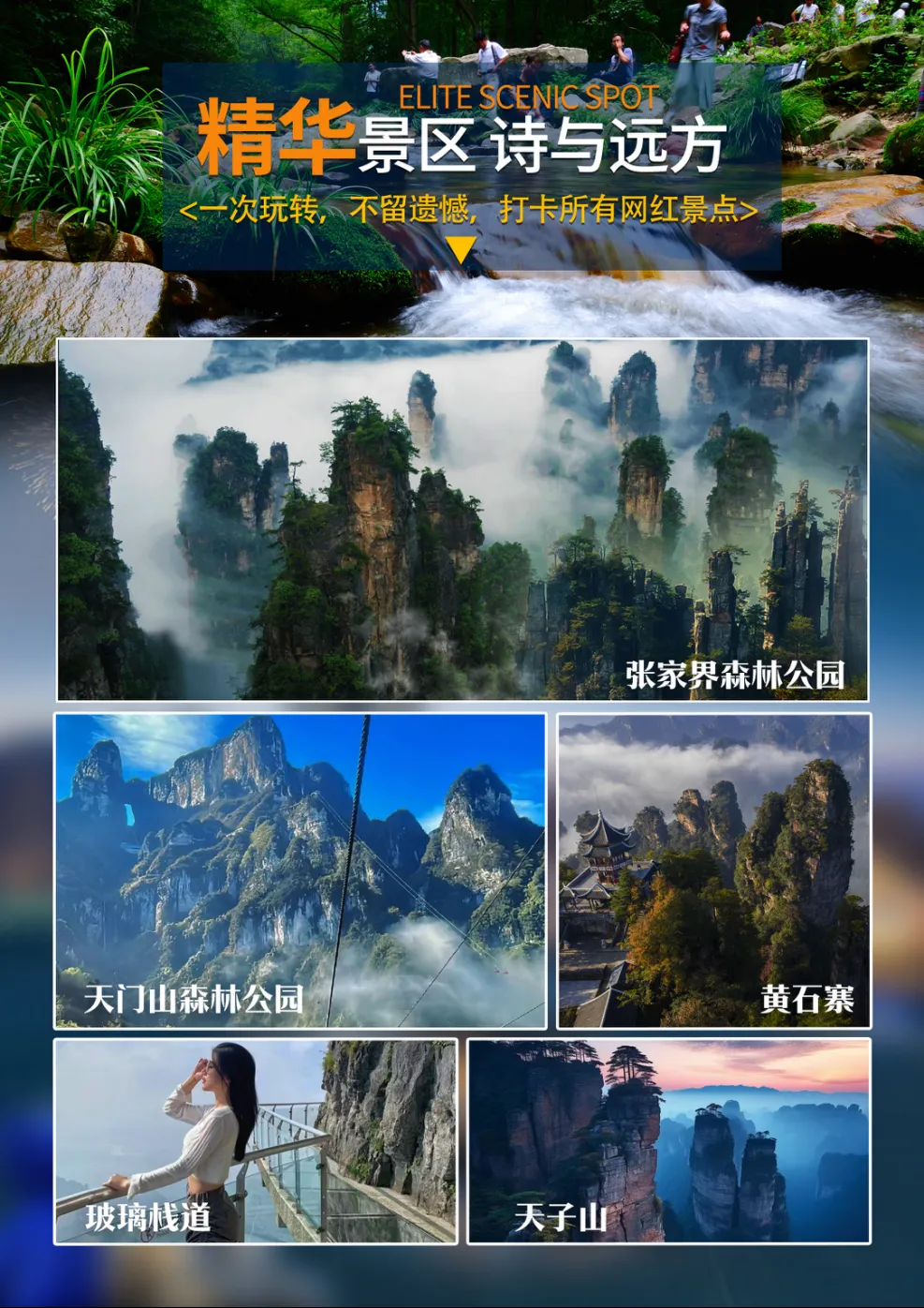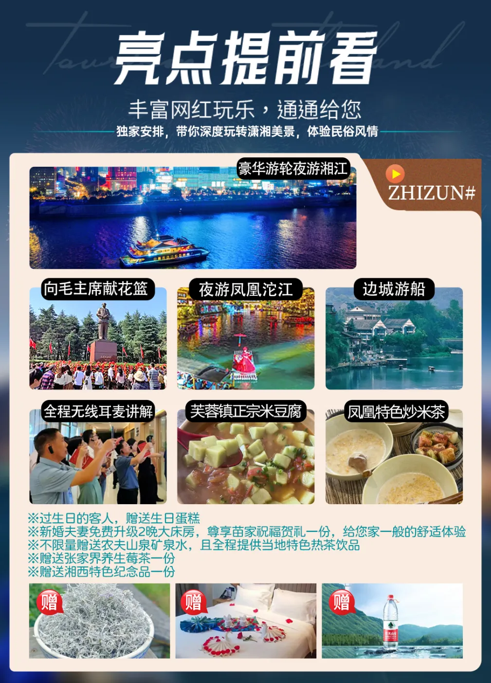 2、湖南属丘陵地带,湘西多山区,建议穿登山鞋,运动衣等轻便服饰;天气多变,带好防晒用品及雨具;另车程路途较远,可自行准备些许感冒药、小零食、晕车药等以备不时之需。
