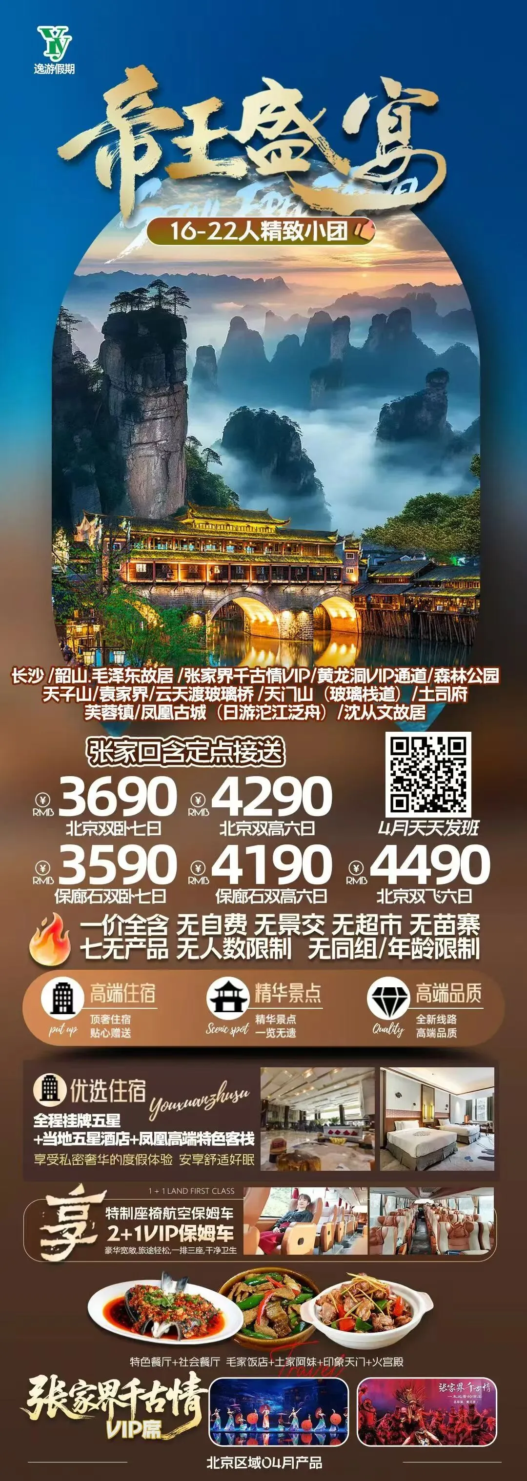 4月【五星帝王】六日~长沙 /韶山 /张家界国家森林公园/千古情VIP座/黄龙洞(VIP通道)/天子山/袁家界/云天渡/