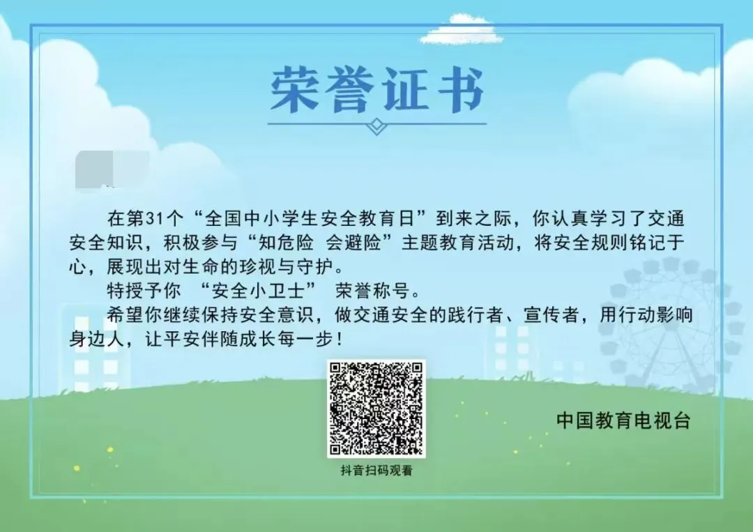 3月27日,幼儿园老师邀请家长与孩子共同观看“知危险会避险”交通安全科普视频,聚焦孩子日常出行中常见的风险场景,结合真实事故案例,直观讲解交通规则、盲区识别、骑行规范等关键内容,让孩子掌握实用的安全防护技能。结合实际出行场景进行引导和讨论,帮助孩子将知识转化为日常安全习惯。观看过后免费领取由中国教育电视台颁发的“安全小卫士”电子证书。
