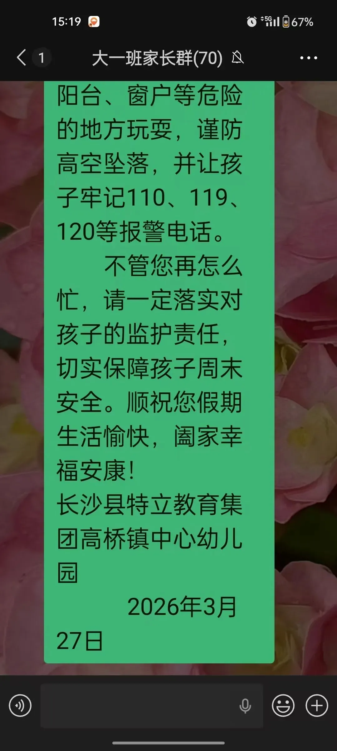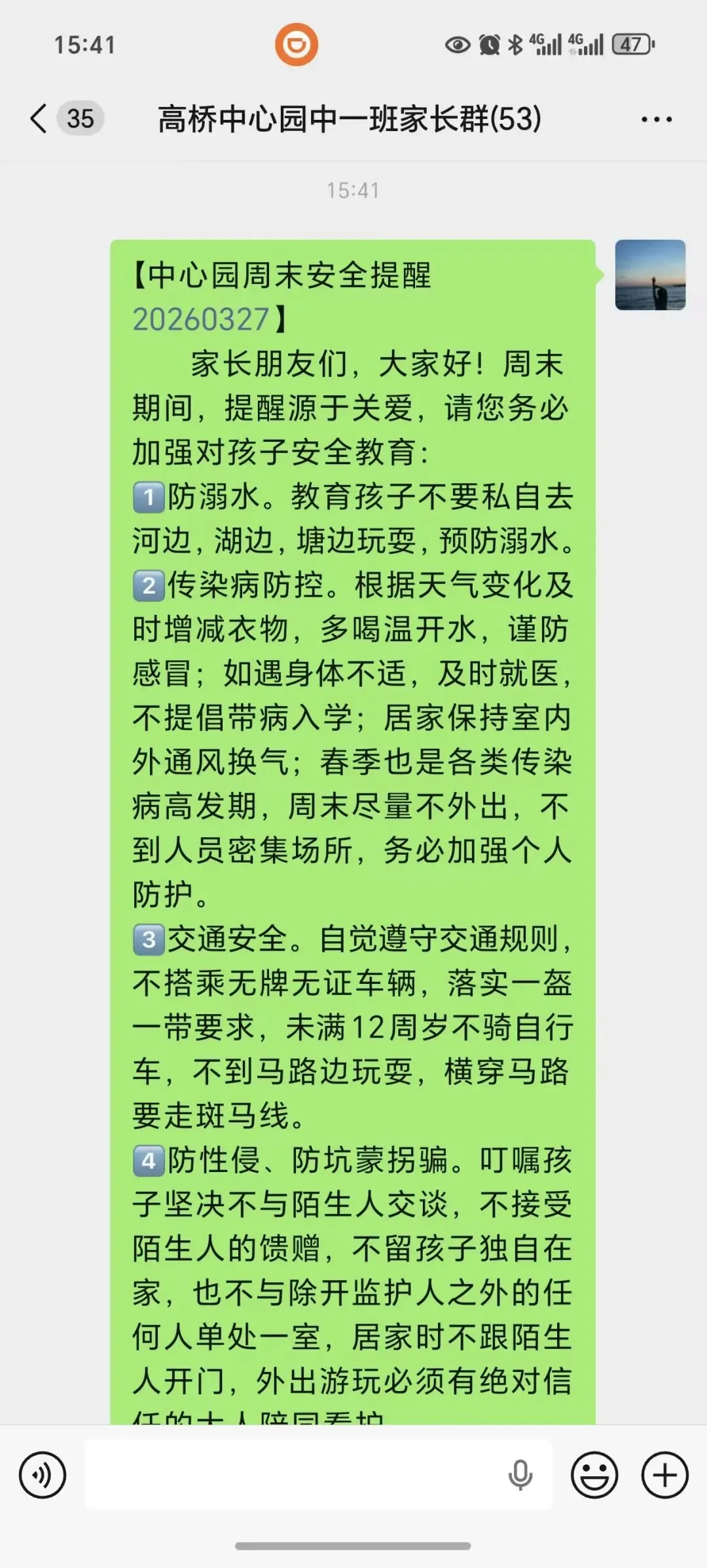 各班级老师,周末利用班级微信联系群,对幼儿家长进行防溺水、交通安全、消防安全等进行安全温馨提醒,并转发交通安全告知书知各班级群,家园合作共同守护孩子的健康成长。