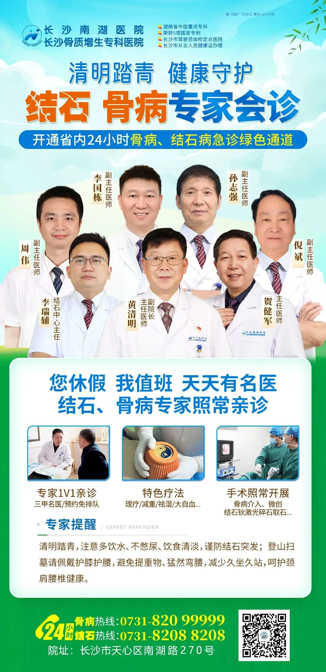 【您休假 我值班】长沙南湖医院清明假期骨病、结石专家轮班亲诊,同时开通省内骨病、结石24小时绿色通道!
