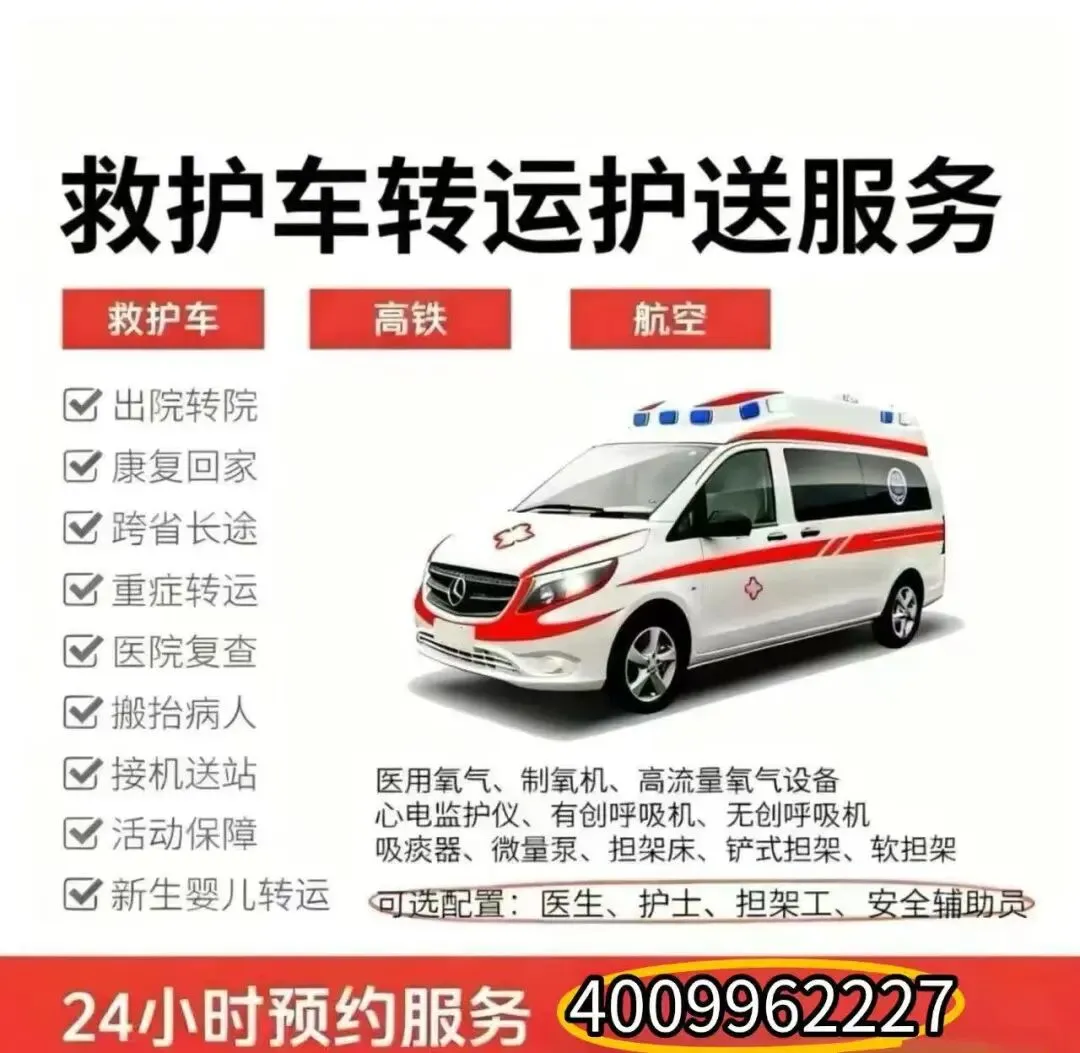 我们是救护车出租转运公司,120救护车接送病人预约护送。24小时为术后康复、危重患者及跨区域就医人群提供专业医疗转运服务,提供120救护车出租‖救护车转运‖私人120救护车(非急救)‖跨省长途转运‖危重病人转运‖市内转运‖术后康复病人转运‖高铁病人转运‖患者返乡‖大型活动赛事保障‖配备ICU设备:呼吸机▪心电监护仪▪吸痰器•微量泵•氧气▪急救药箱▪专业医护团队救护车出租转运电话:4009962227