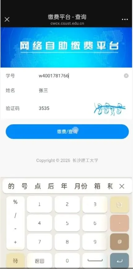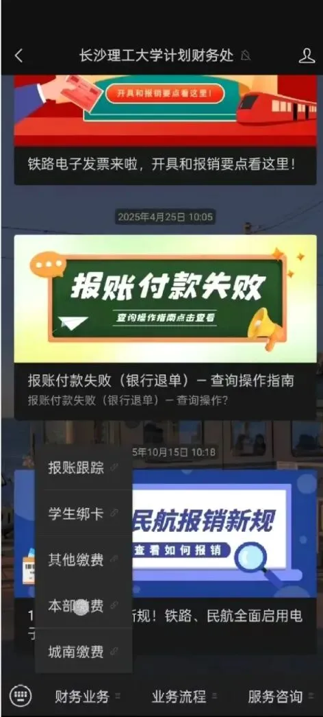 一、关注“长沙理工大学计划财务处”公众号,在左下角“财务业务”处,找到“本部缴费”