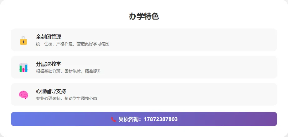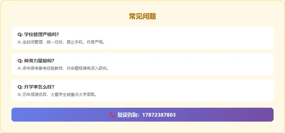 温馨提示:选择复读学校时,不要只看价格,更要看办学质量、师资力量、管理水平和历年成绩。教育投资是值得的。