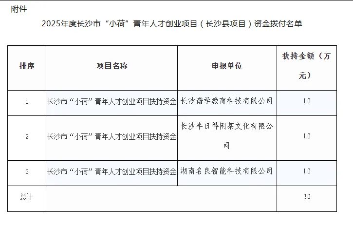 根据《长沙市人力资源和社会保障局<关于公布2025年度长沙市“小荷”青年人才创业项目,创新创业带动就业项目(含大学生创业项目),一次性创业补贴(含大学生一次性创业补贴和经营场所租金补贴)的通知>》(长人社发〔2025〕39号)文件精神,拟对获评2025年度长沙市“小荷”青年人才创业项目进行扶持资金拨付,扶持资金共计300000元。现将2025年度长沙市“小荷”青年人才创业项目获得扶持资金情况予以公示,公示期为5个工作日,如有异议,请在公示期内以书面或电话形式向监督部门:长沙县人力资源和社会保障局(0731-84931977)和长沙县财政局(0731-84011710)反映。