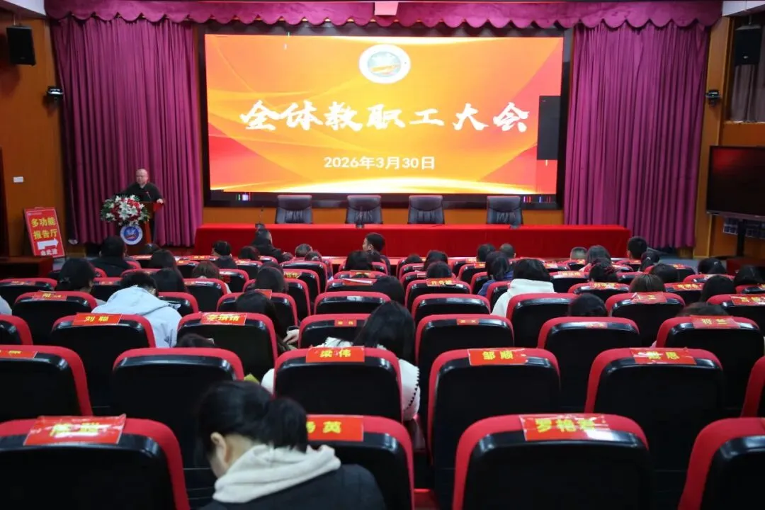 本周一中午,学校于多功能报告厅召开全体教职工大会,会议聚焦校园各项工作推进,对德育、安全、教学等核心事宜进行全面部署安排。德育处杨韬主任率先就校园就餐工作提出要求,强调就餐纪律需班主任与德育处等部门通力配合,共同营造良好就餐秩序。刘志慧校长作核心讲话,围绕多方面工作提出具体要求:强调班主任要重视主题班会开展,尤其九年级要多措并举做好学生思想教育;安全教育抓实抓细,落实防性侵、防欺凌等常规安全教育,重点关注学生心理健康与特殊学生情况,同时明确次日中午召开融合教育专题会,本周启动相关课程。教学方面,针对九年级仅剩 9 周中考的现状,要求各毕业学科提升复习系统性,非毕业学科把控教学进度,各年级依托测试数据开展分层辅导;体育中考预计 4 月 15 日启幕,体育老师需利用剩余 10 几天强化训练。会议还提醒教职工注意清明假期往返途中的安全,此次会议为后续工作明晰了方向,凝聚了全体教职工的工作合力。