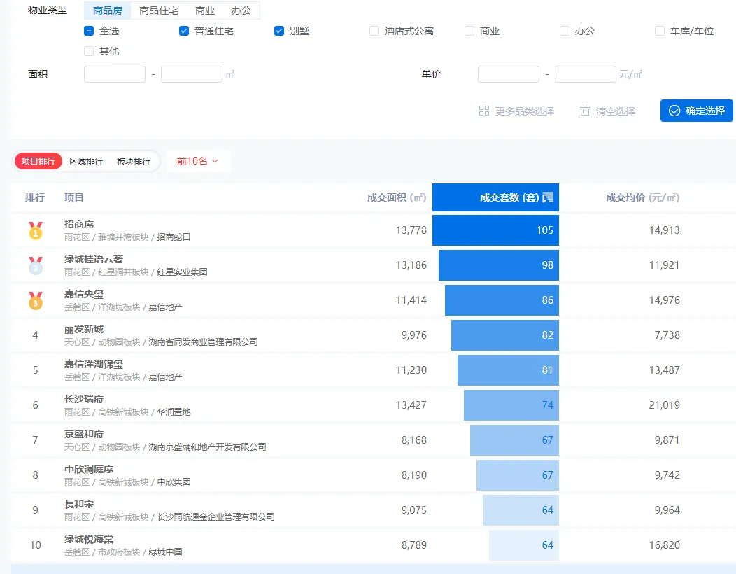 榜单前十名中,既有长沙瑞府、嘉信央玺、招商序等定位较高的网红改善盘,也有绿城桂语云著、丽发新城、長和宋等高性价比项目。