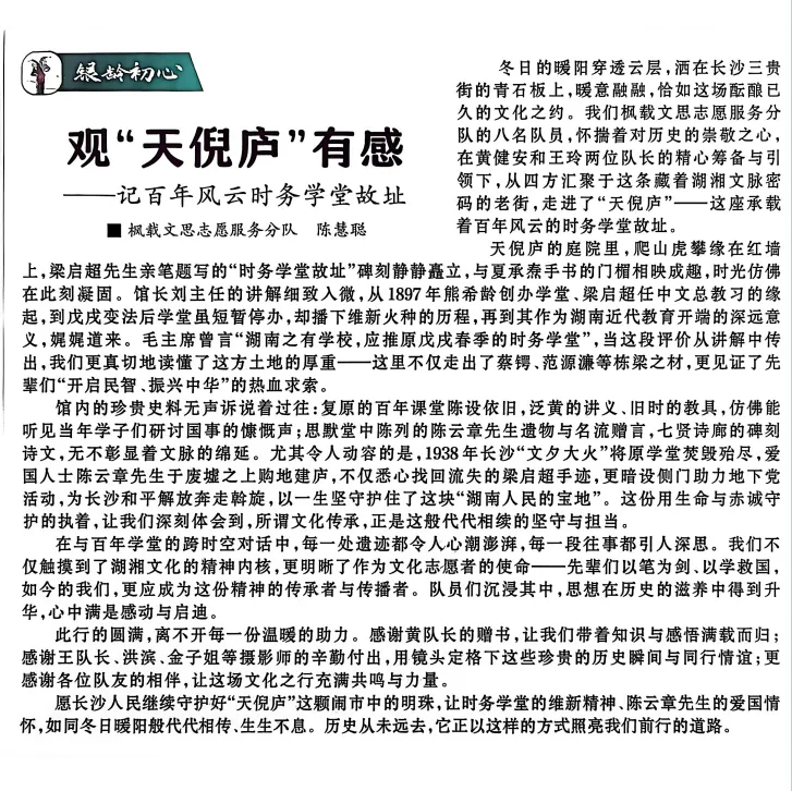 在与百年学堂的跨时空对话中,每一处遗迹都令人心潮澎湃,每一段往事都引人深思。我们不仅触摸到了湖湘文化的精神内核,更明晰了作为文化志愿者的使命——先辈们以笔为剑、以学救国,如今的我们,更应成为这份精神的传承者与传播者。队员们沉浸其中,思想在历史的滋养中得到升华,心中满是感动与启迪。