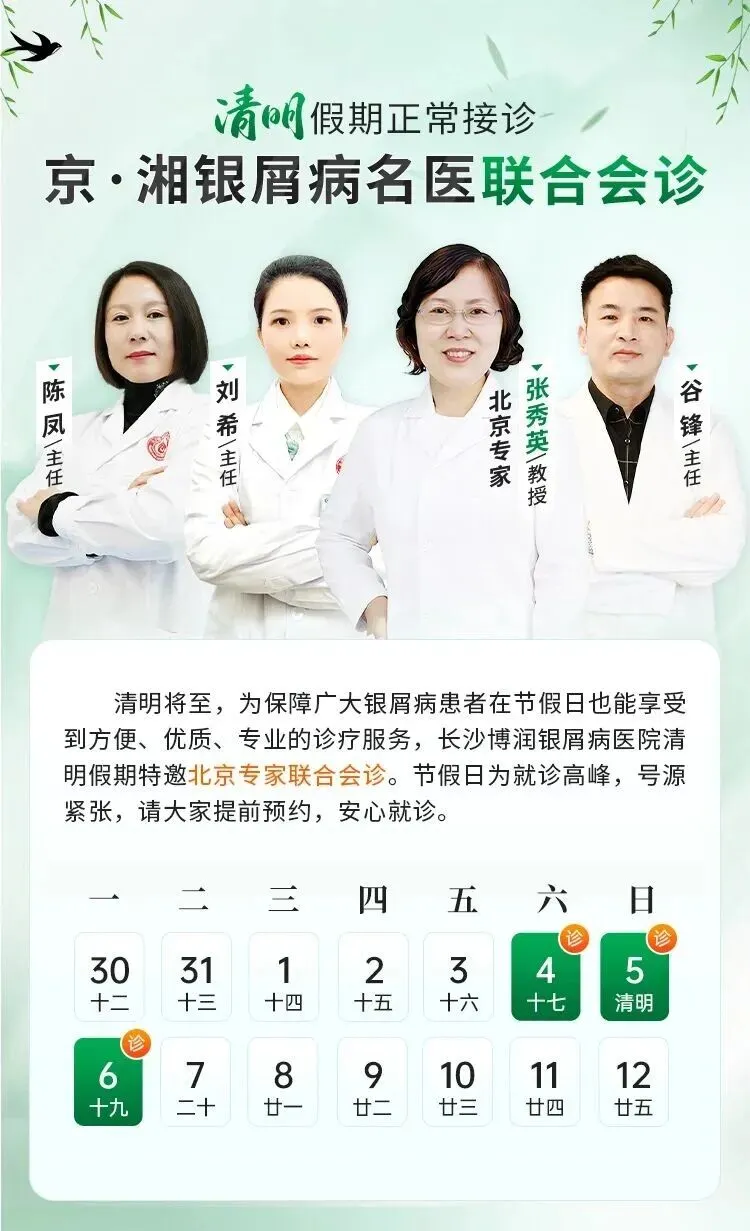 清明期间,长沙博润银屑病医院正常接诊,专家照常坐诊,检查、治疗、护理一站式开展,不让你的治疗 “断档”。