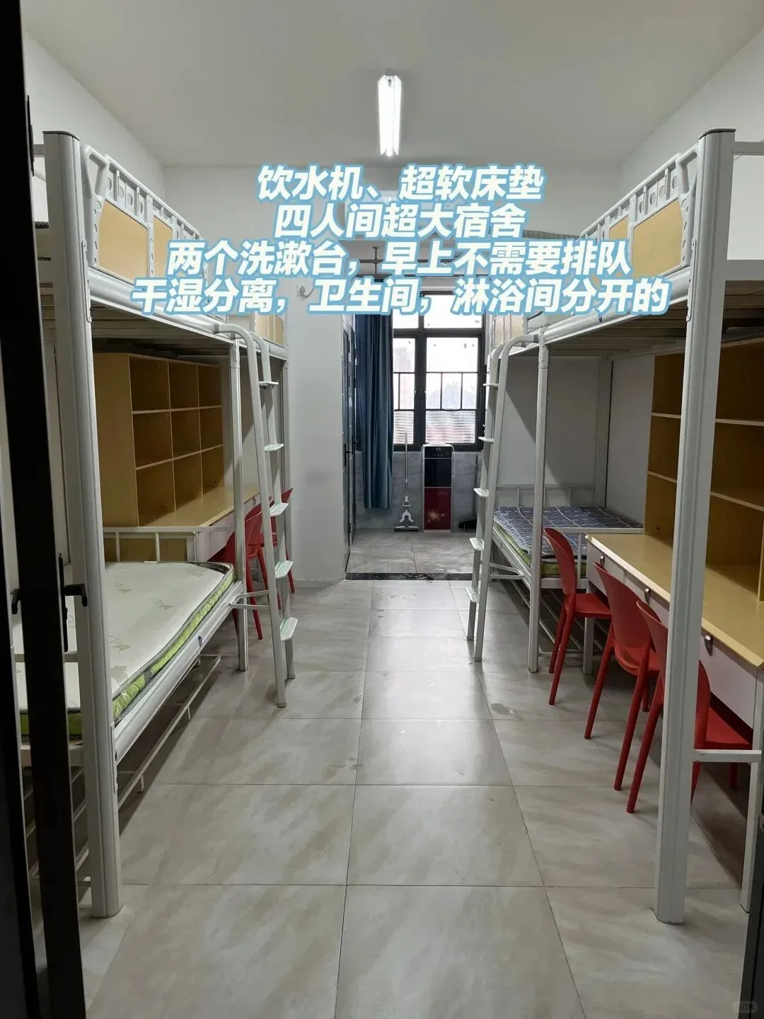 宿舍干净整洁,男女分栋,每栋都有宿管阿姨
