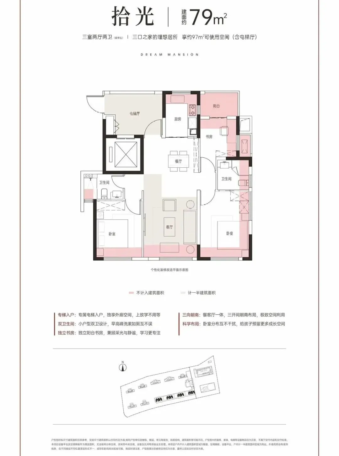 建面约79㎡三房户型:独梯入户、约3.6m客厅开间、三开间朝南、得房率约123%(含电梯厅),实际可得面积约97㎡。