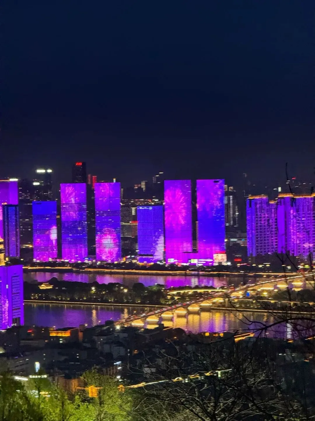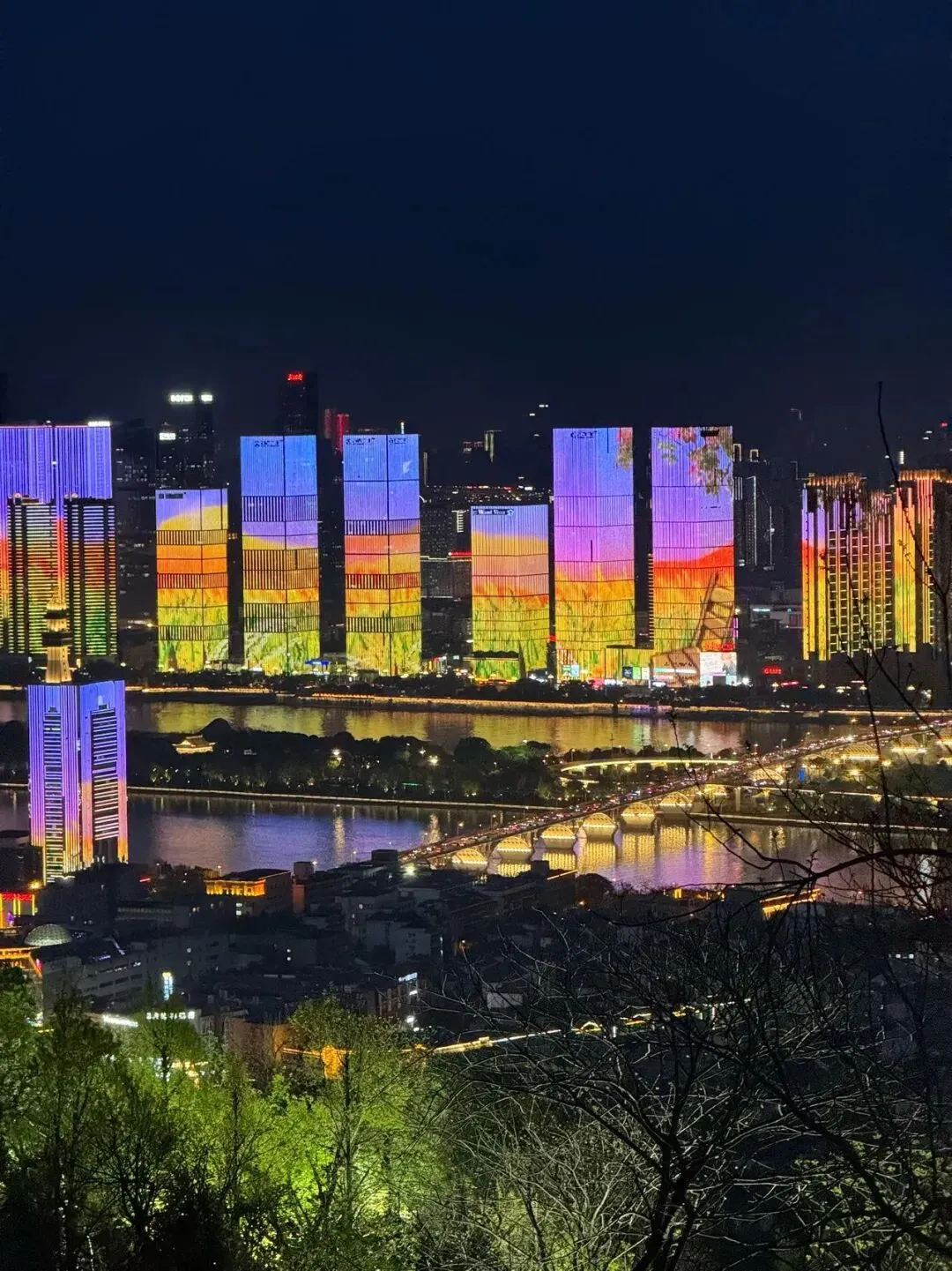 站在岳麓山顶,湘江两岸的灯火像被谁打翻的颜料盘,泼洒出满城流光。楼宇的外立面成了巨大的画布,橙黄与紫蓝交织,像晚霞吻过天际;转瞬又化作紫色花火,在夜空中炸开,倒映在江面上,晃成一片流动的光海。桥上的车流是缀满明珠的项链,远处的天际线在夜色里若隐若现,近处的树影在灯光下泛着深浅不一的绿。这夜景没有太多复杂的意象,就是纯粹的亮——亮得热烈,亮得温柔,亮得让人忍不住想,原来长沙的夜,可以这么好看。