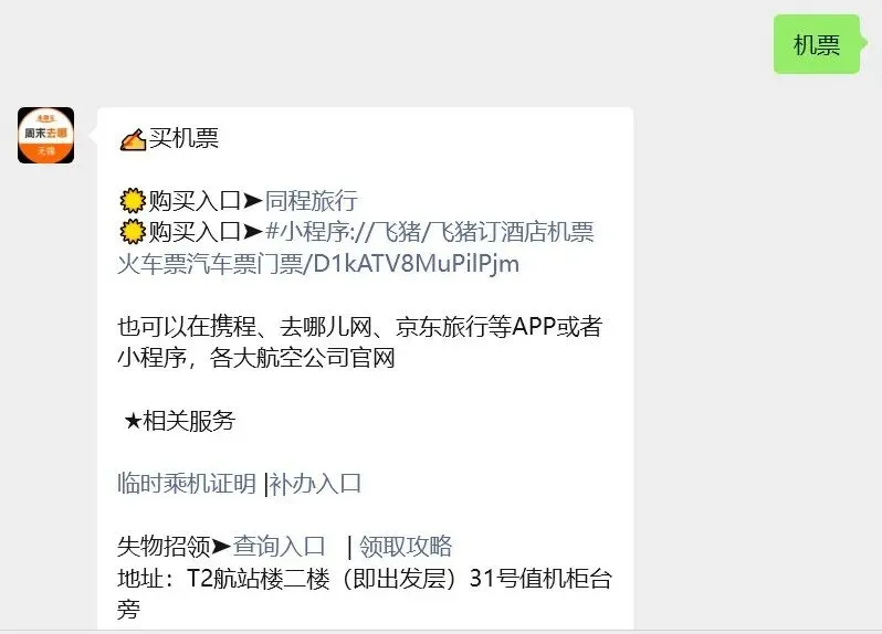 小编提醒:点击下方进入【无锡周末去哪】公众号,在对话框回复【机票】快速获取机票购买入口、硕放机场服务等信息