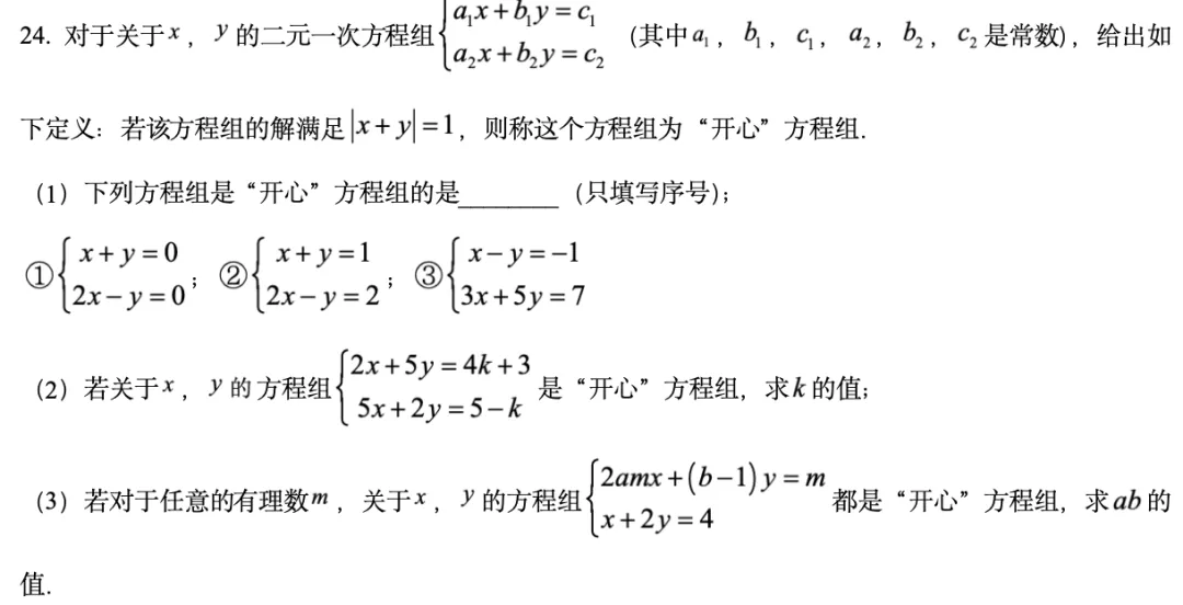 3. 解答压轴24题:开心方程组(新定义)这道题是解答题,分值6分,第一问基本是送分,第二问稍微难一点,拆解思路特别固定。核心规则:方程组的解满足x+y=1,就是“开心方程组”。