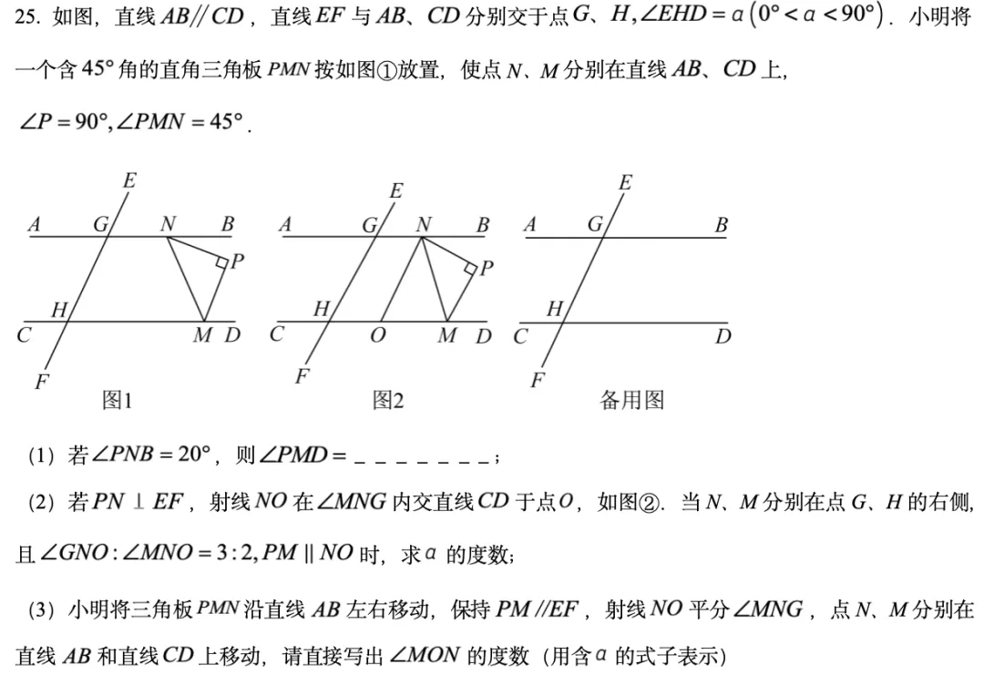 解题步骤:第一步,解普通的二元一次方程组,算出x和y的具体值;第二步,把算出的x和y代入x+y=1,求出参数;第三步,如果题目说“任意有理数成立”,就让系数为0,求出定值。4. 解答压轴25题:平行线+三角板平移(角度探究)这道题是几何压轴,分值6分,是整张试卷最难的压轴题之一,但拆解后其实也有迹可循。