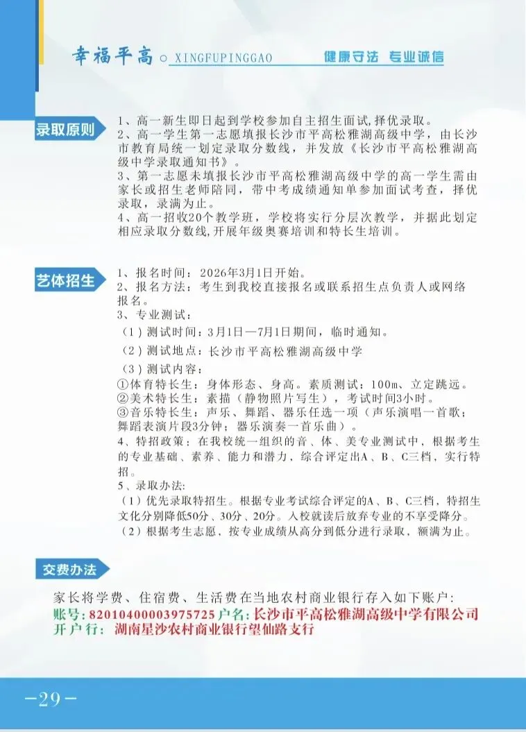 >长沙市平高松雅湖高级中学2026年秋季高一招生简章