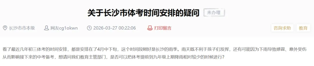 为此,有家长在“百姓呼声”上建议:长沙体育中考每年都是雨季,能够调整一下时间?