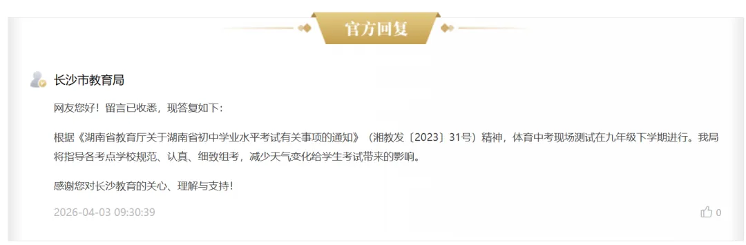 对此,教育部门已经做出回复:根据省教育厅要求,长沙体育中考安排初三下学期进行,已经指导考点学校做好准备工作,减少天气带来的影响。