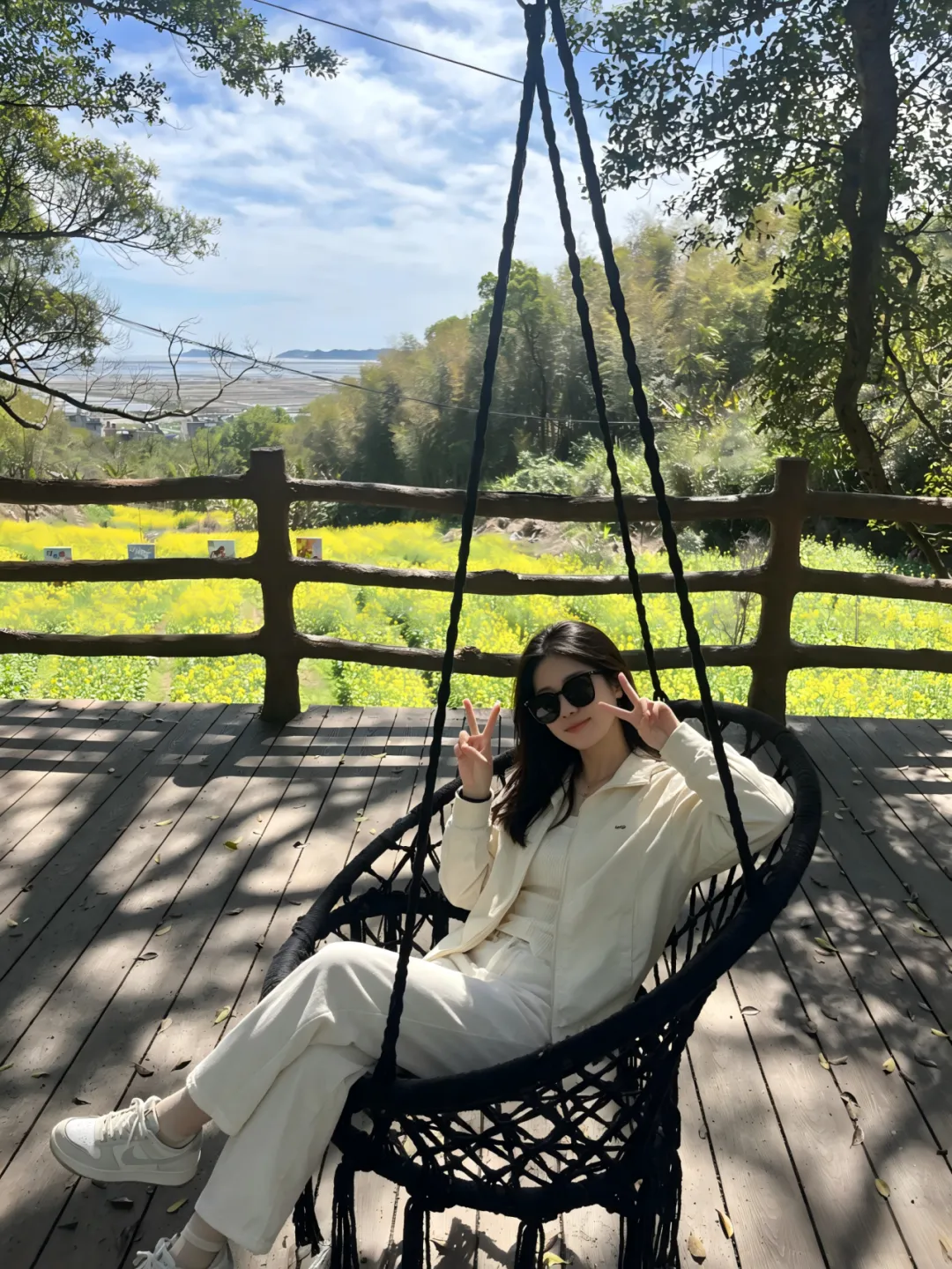 寻一处静谧,坐进花海中的秋千,让微风带着油菜花的香气拂过脸颊。远处是福宁湾畔,眼前是满目金黄,随手一拍,都是充满诗意的大片。