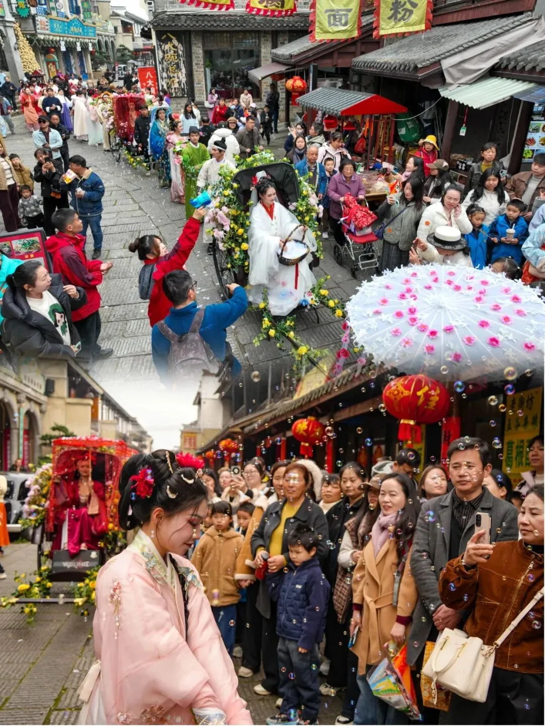 古镇+花朝的神仙组合,花瀑花海铺满古街,十二花神巡游打卡超出片;花神茶话会、簪花DIY、团扇手绘,亲手制作春日小物;逛古风市集、玩投壶套圈,在青石板路上感受传统清明的悠然惬意。