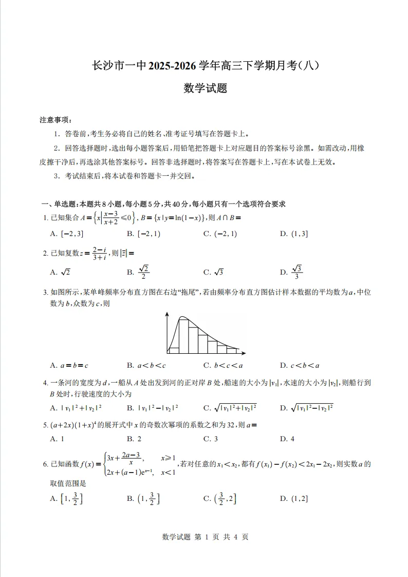>【高三】湖南省长沙市第一中学2026届高三下学期3月阶段检测(月考八)数学含解析(word版)