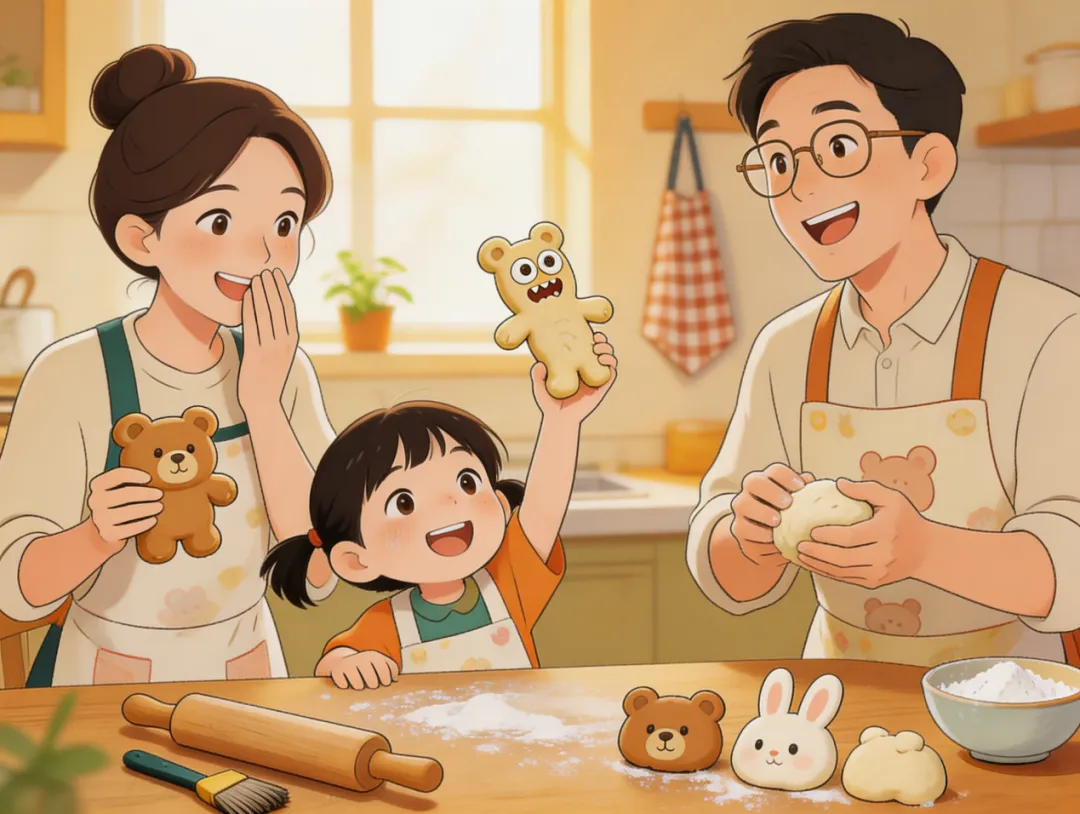 周末亲子时光:全家一起动手做面点,你做的小面点造型奇特,惹得全家开怀;