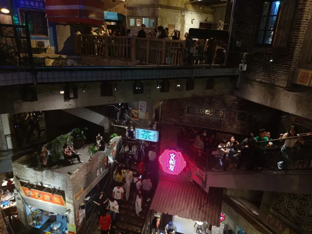 逛累了,便去文和友赴一场怀旧与美食的盛宴。走进海信广场的文和友,瞬间穿越回八九十年代的老长沙。复古的居民楼、斑驳的砖墙、怀旧的霓虹灯牌、老式的游戏机、旧时光的商铺布景,每一处细节都复刻着老长沙的市井风貌,既是美食聚集地,更是沉浸式的城市记忆博物馆。