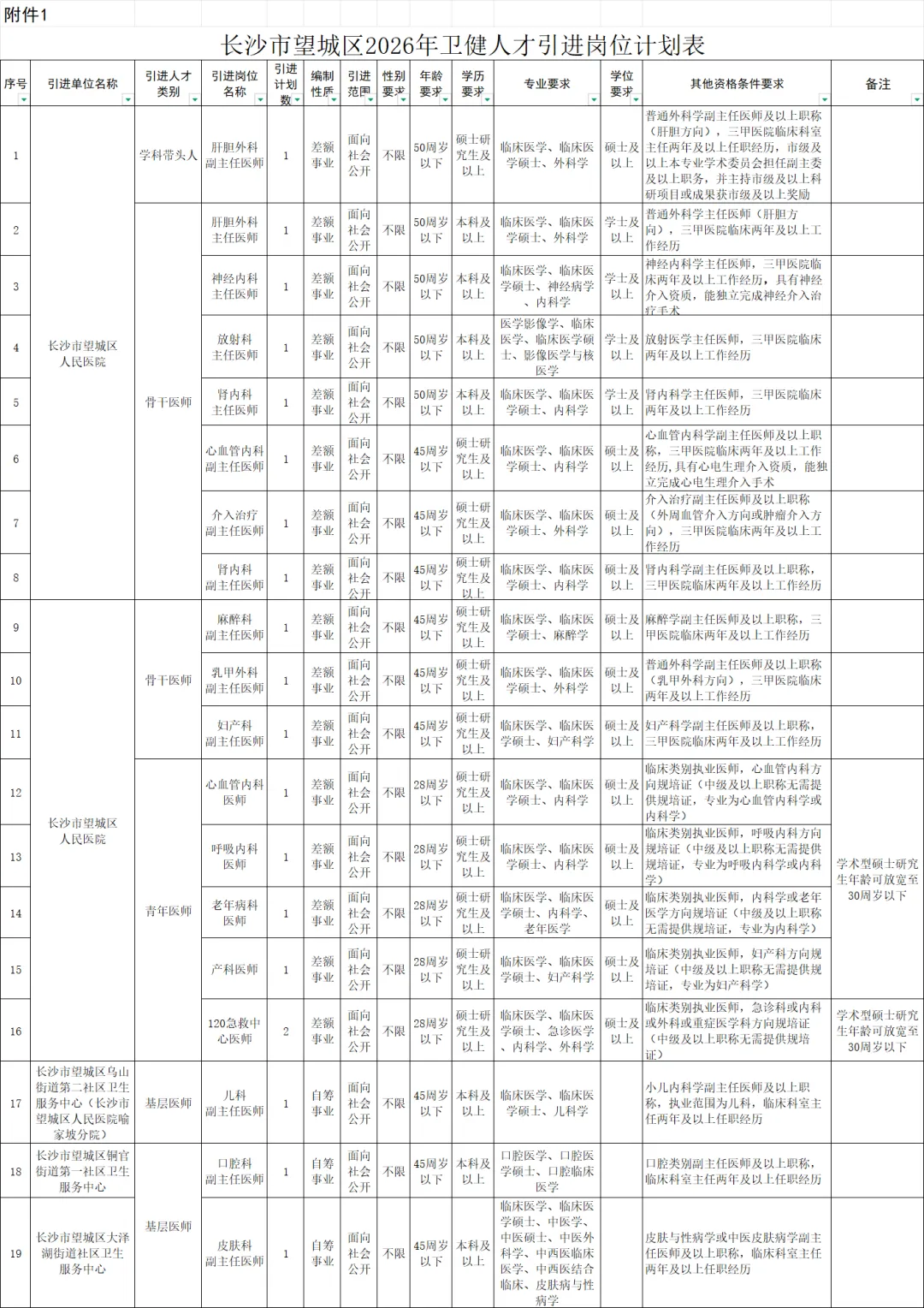 1.长沙市望城区2026年卫健人才引进岗位计划表