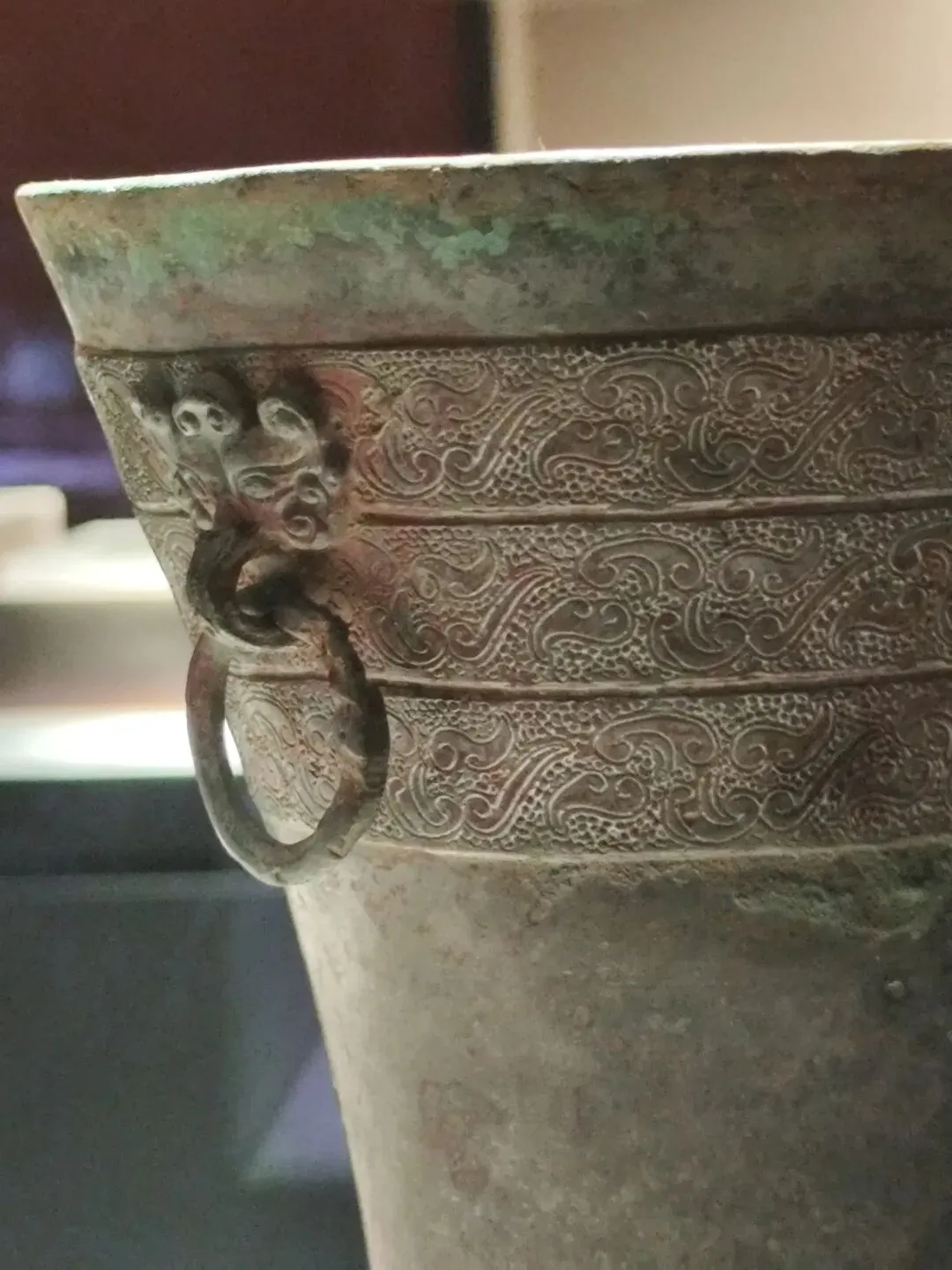 - 杯口与圈足对称分布四组共八个兽面衔环铺首,造型生动,衔环可活动,工艺精巧。