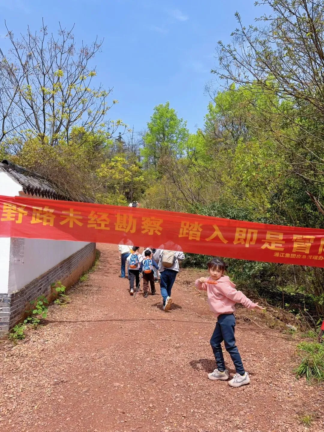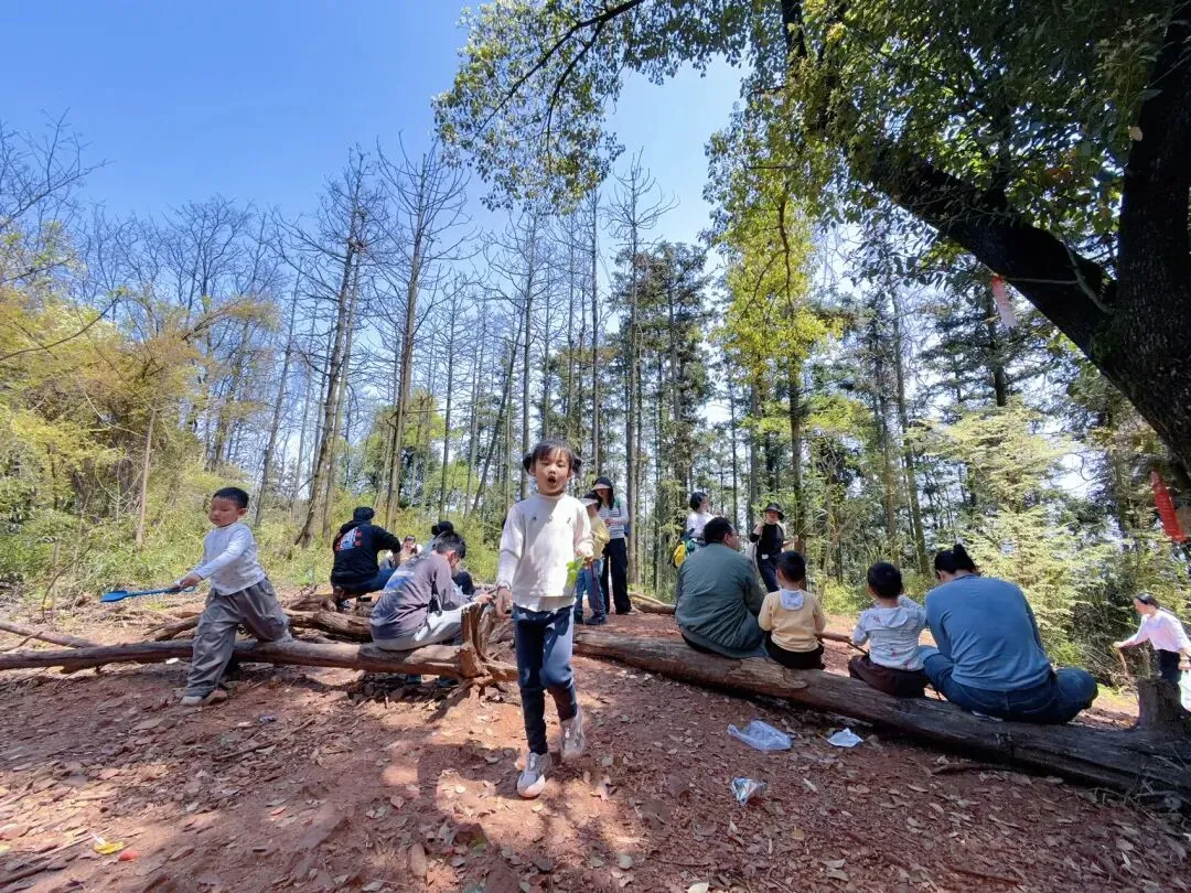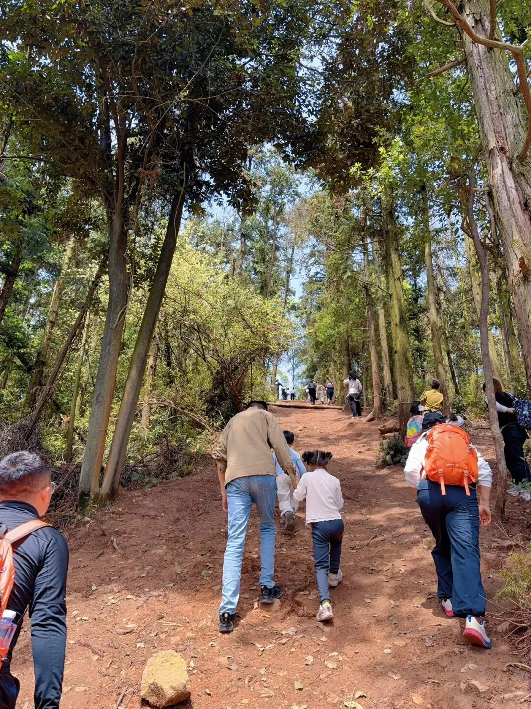 一路上,鸟语花香,流水潺潺。阳光渐暖,微风不燥,徒步爬山的人络绎不绝,都是带孩子来体验徒步爬山的。