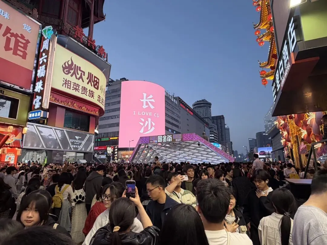 游客们举着手机打卡粉屏、排队吃湘菜、逛遍潮店,把黄兴路变成了流动的“长沙生活展”。