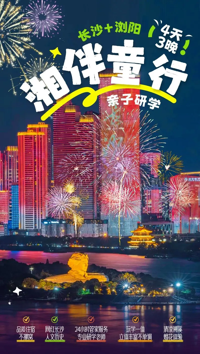 天黑后在专业老师的带领下,前往浏阳河畔指定安全区域,开展江畔烟花燃放活动,看绚烂烟火在江畔绽放,亲子共同定格这一浪漫美好瞬间,燃放结束后专车返回长沙酒店入住
