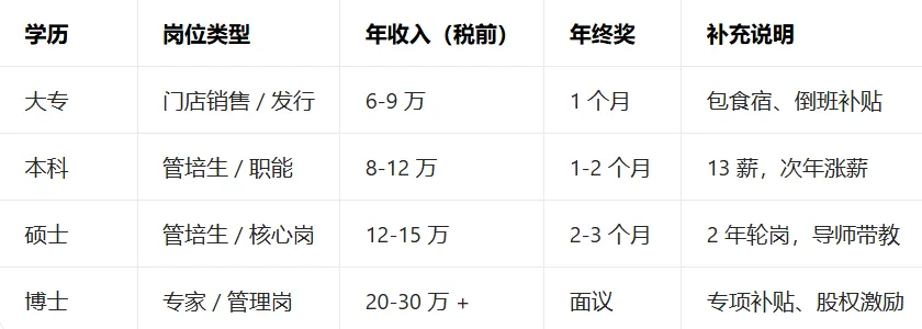 硕士:综合年收入12-15 万,管培生专项培养,2 年轮岗 + 导师带教。