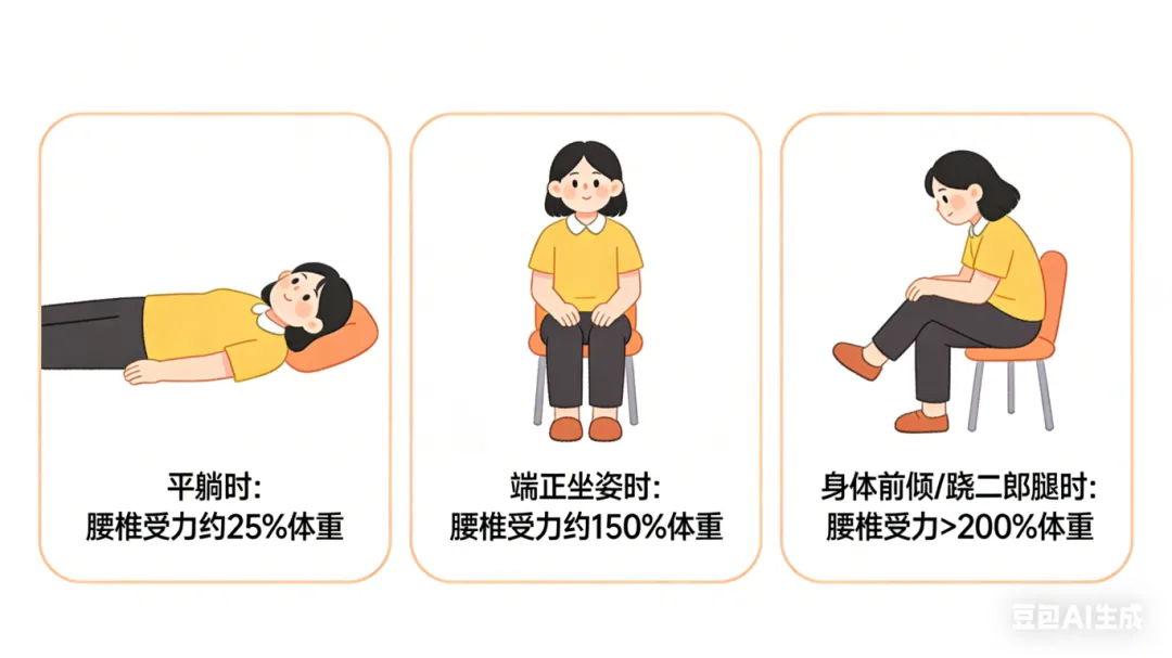 换句话说,你每多坐1小时,腰椎间盘承受的负荷就相当于一个成年人连续站立2小时。日积月累,纤维环可能出现微小撕裂,髓核逐渐向外突出,压迫到周围的神经根——这就是腰椎间盘突出症最常见的发展路径。