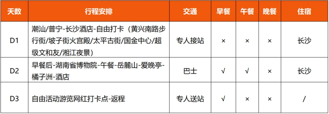 1、用车:含潮汕/普宁往返长沙高铁二等座;头尾单接送站及第二天空调旅游大巴车,根据人数安排车型,保证每人一正座(若直达动车票紧张或无票则出中转站至目的地,动车票为实名制出票,如退票产生损失由游客承担,高铁票由铁路票务系统随机出票,无法指定连座或指定同一车厢)
